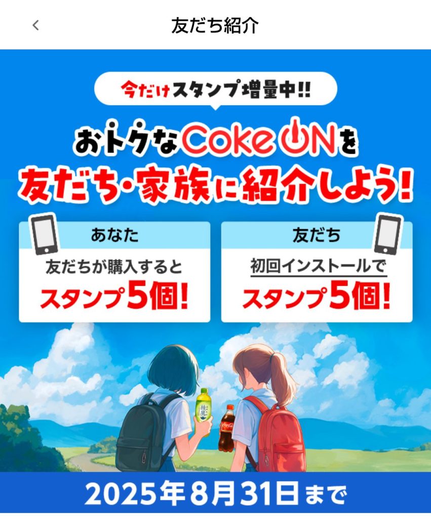 コークオンでは、友達をアプリに招待すると、紹介した人・された人の両方にスタンプがプレゼントされるキャンペーンがあります(※時期によっては変更あり)。